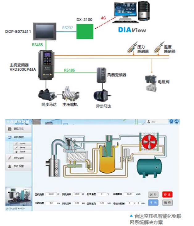 臺(tái)達(dá)解決方案整合了自有SCADA工業(yè)組態(tài)軟件DIAView系列、工業(yè)電腦、工業(yè)電源、4G無(wú)線模塊、人機(jī)界面、變頻器等。方案的創(chuàng)新在于實(shí)現(xiàn)了空壓機(jī)的智能化的控制,同時(shí)也可以將空壓機(jī)的控制信息納入工廠能源管理系統(tǒng)EMS的系統(tǒng)管控中。
