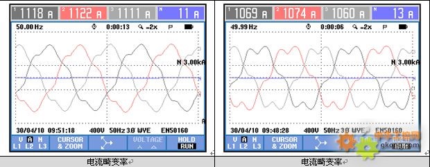 由以上數(shù)據(jù)可以清晰看出投入傳統(tǒng)無(wú)功補(bǔ)償裝置前后:配電系統(tǒng)電壓畸變率由4.8%放大到6.5%,超過(guò)國(guó)標(biāo)14549-93標(biāo)準(zhǔn);配電系統(tǒng)電流畸變率由9.5%放大到18.9%,總諧波電流由由112A放大到202A;配電系統(tǒng)電流波形由不規(guī)則單峰變成雙峰,主要放大諧波以5次和11次諧波較為明顯。