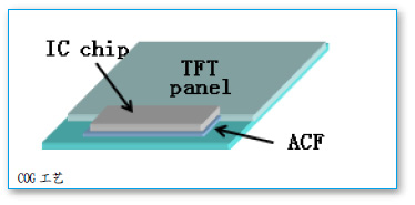 COG,即Chip On Glass,是一種將IC通過ACF(Anisotropic Conductive Film:各向異性導(dǎo)電膜)直接綁定到LCD的工藝。這種工藝能大大減小LCM(液晶顯示模塊)的體積,是未來IC與LCD連接的主要方式。