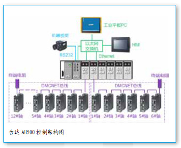 ■DMCNET總線控制:1個(gè)AH20MC模塊可帶12軸,18軸用2個(gè)AH20MC模塊,采用“12軸+6軸”的組合方式。該總線方案較其它品牌的脈沖型控制方案,具有省配線、控制速度快(通訊速率可達(dá)10Mbps)、可靠性高的優(yōu)點(diǎn)。