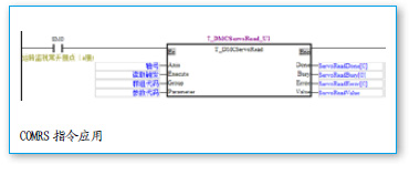 DMCNET通訊初始化,通過DMCControllnit功能塊來實(shí)現(xiàn),用于設(shè)置各個(gè)伺服的電子齒輪比和將AH20MC與伺服作控制狀態(tài)對(duì)應(yīng),開機(jī)后只要操作一次即可,也是后續(xù)所有操作的第一步。初始化完成后,伺服默認(rèn)處于ServoOn的狀態(tài)。