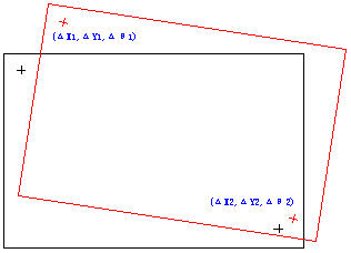 由于材料本體尺寸比較大,如果將被測物完全拍攝到,則其檢測精度必然無法達到要求。所以考慮只拍攝該板材上的上下兩個MARK(標記)的位置,獲知兩個MARK點的偏移量后可通過推導得出該板材的整體偏移量以及旋轉角度。