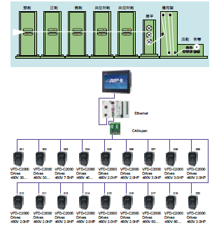 針刺機為當今生產(chǎn)無紡布的主要設備之一,設備機組較多,為了生產(chǎn)方便操作,傳統(tǒng)的控制一般是一組設備使用1臺PLC+1臺HMI+AMD進行控制。操作方便,但是布線及通訊復雜,抗干擾性能差,通訊距離短。此外,傳統(tǒng)控制,大量的通訊程序使小型PLC內(nèi)存(16K steps)受到極大的考驗。我們的方案主控采用臺達DVP28SV配合SV系列左側(cè)擴展模塊DVPCOPM-SL,支持CANopen協(xié)議。與SV連接使用CANopen總線應用時,DVPCOPM-SL負責PLC與總在線所有從站數(shù)據(jù)的交換。Master將PLC數(shù)據(jù)傳送到總在線的各個從站,實現(xiàn)主從站間的數(shù)據(jù)交換。