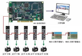 PCB鉆孔機的運動控制系統(tǒng)架構(gòu)A01運動控制卡1張。X軸5.5kW A2-F伺服、Y軸5.5kW A2-F伺服、Z1軸750wA2-F伺服帶兩個主軸、Z2軸750W A2-F伺服帶兩個主軸、Z3軸750W A2-F伺服帶兩個主軸。圖4為運動控制架構(gòu)示意圖。