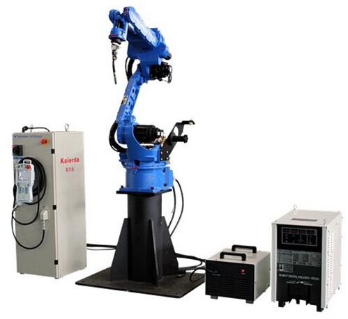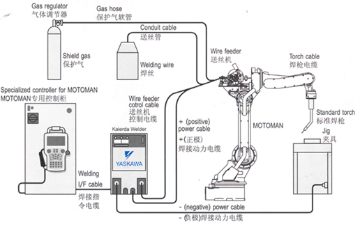 ?    系統(tǒng)組成:6軸關(guān)節(jié)機器人、焊接電源、焊槍、送絲機等。配備電弧跟蹤系統(tǒng)、機器人弧焊、起始點跟蹤、多層多道焊接系統(tǒng)。