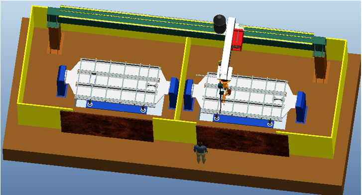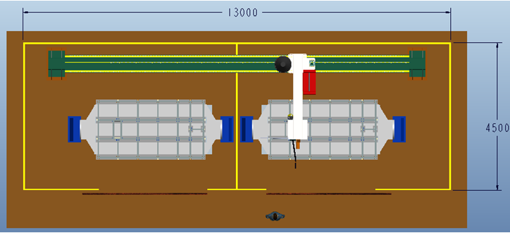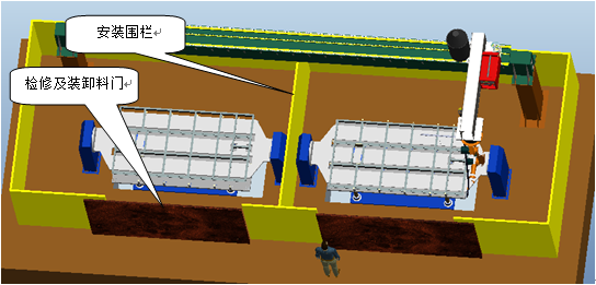 將所有運動設(shè)計布置與圍欄內(nèi),可以為工人及其他相關(guān)人員提供一個安全可靠的工作環(huán)境。圍欄布置有檢修和人工上料門,布置必要的檢測開關(guān),并與整套控制系統(tǒng)聯(lián)動,在設(shè)備正常工作時,假如有人員闖入,將立即停止所有設(shè)備的運轉(zhuǎn),確保人員安全。其分為兩個獨立部分,集體結(jié)構(gòu)見下圖。這樣可以將兩個工位分成獨立的兩個工作空間,使得人工裝卸料和焊接分開獨立運行,互不影響。