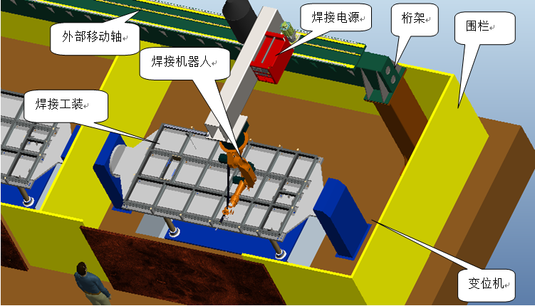 此系統(tǒng)為實現(xiàn)機架的自動化焊接而特別設(shè)計的。本系統(tǒng)選用一臺六軸工業(yè)機器人及配套的焊接電源、焊槍、送絲機等;自行設(shè)計機器人外部移動軸、變位機、焊接工裝及配套安全防護系統(tǒng);配套專業(yè)焊接控制系統(tǒng)和智能界面,采用人工上下工件,完成工件從夾緊——散件點定——焊縫滿焊的自動化焊接。