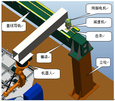 外部移動軸為機器行走機構(gòu),實現(xiàn)不同工位弧焊機器人的位置變換、同時在長度方向上適應工件的焊接范圍。此機構(gòu)采用伺服電機驅(qū)動,齒輪齒條傳動,直線導軌導向,機架采用桁架結(jié)構(gòu),其采用型鋼焊接,分段制造、整體組裝。具體結(jié)構(gòu)見下圖。
