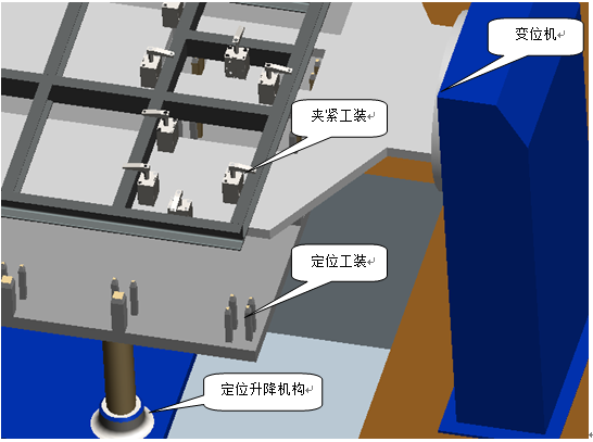 ?    第二:定位升降機構(gòu)將安裝其上的定位工裝頂升至夾緊工裝下部,并貼靠夾緊工裝,使定位工裝、夾緊工裝成為一個整體。