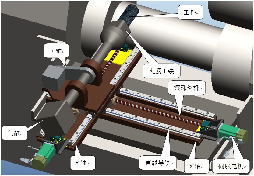 1. 輥軋機(jī)械手方案由X軸、Y軸、α軸、夾緊工裝、電控系統(tǒng)及氣路系統(tǒng)。XY 軸由伺服電機(jī)、直線導(dǎo)軌、滾珠絲桿和機(jī)座構(gòu)成;α軸由伺服電機(jī)、同步帶、同步帶輪等構(gòu)成;夾緊工裝由氣缸和夾緊機(jī)構(gòu)等構(gòu)成;