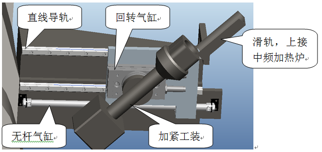 3) 工件通過無桿氣缸推動(dòng)到上料輥鍛機(jī)械手;
