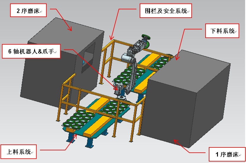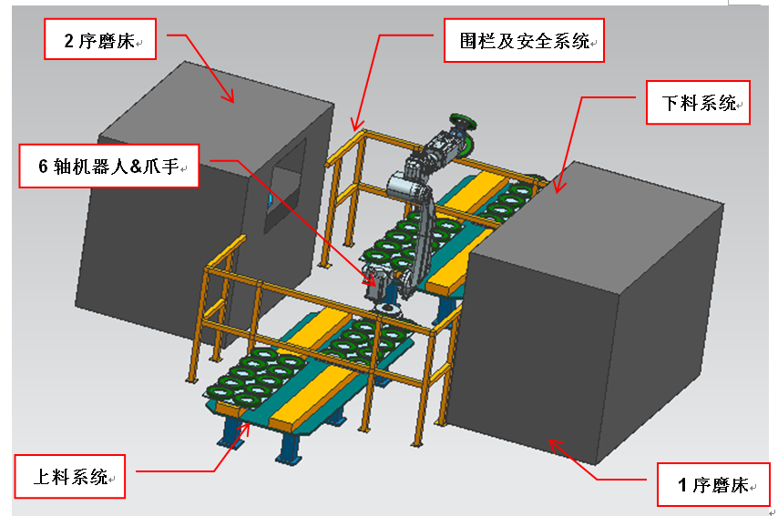 本自動化系統(tǒng)的目標是實現(xiàn)齒輪零件中孔兩序磨削的自動上下料,通過對客戶加工設備的重新布局、同時引入機器人、上料組件和下料組件來實現(xiàn)這個目標。進而達到改善現(xiàn)場作業(yè)環(huán)境,提高生產(chǎn)效率,減少員工崗位配置的效果,滿足客戶對生產(chǎn)工藝及產(chǎn)品質量的要求。