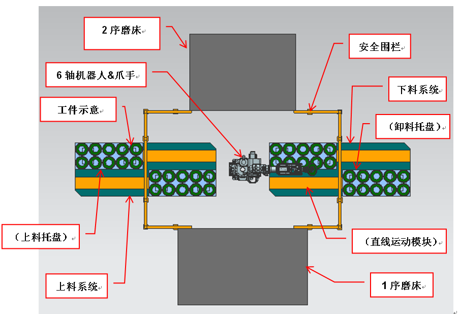該系統(tǒng)是由(兩序)磨床、1臺6軸20KG機器人,1套上料系統(tǒng),1套下料系統(tǒng),1套圍欄及安全系統(tǒng)及電器控制(下面圖中未作示意)系統(tǒng)(PLC)組成的自動化生產(chǎn)單元。如下所示。