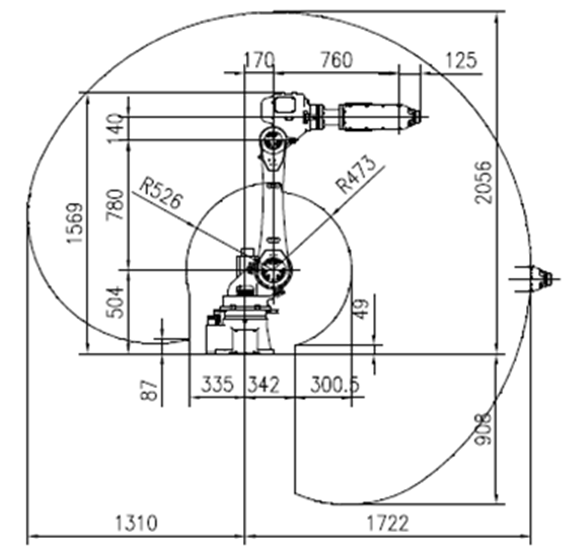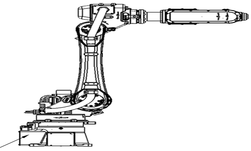 考慮到執(zhí)行端的負載及抓取夾具、總體重量在15KG左右,同時根據(jù)前述的節(jié)拍情況機器人的動作速度可以較低,因此選用20KG級的6軸機器人,其結構如下: