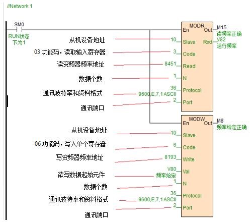 PLC通訊程序簡(jiǎn)單,無論你使用何種通訊協(xié)議都只需一條通訊指令便可完成復(fù)雜的通訊功能。本例變頻器的波特率為9600,資料格式E,7,1,下面為讀取變頻器頻率通訊示例程序。