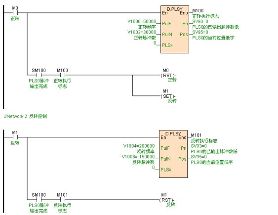 本例伺服采用脈沖加方向輸出方式,所以PLC硬件配置脈沖輸出方式為脈沖/方向輸出,通過PLSY高速脈沖輸出指令來實(shí)現(xiàn)噴嘴的上下移動(dòng)。當(dāng)脈沖輸出個(gè)數(shù)為正數(shù)時(shí),電機(jī)正轉(zhuǎn),帶動(dòng)噴嘴向下移動(dòng);而脈沖輸出個(gè)數(shù)為負(fù)數(shù)時(shí),電機(jī)反轉(zhuǎn),帶動(dòng)噴嘴向上移動(dòng)。