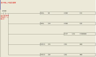 提升機(jī)上行分為加速、勻速、一級(jí)減速及二級(jí)減速四個(gè)過(guò)程,PLC根據(jù)觸摸屏設(shè)計(jì)的工作點(diǎn)參數(shù),通過(guò)內(nèi)部C252高速計(jì)數(shù)器獲得當(dāng)前位置,利用DHSCS高速比較置位指令來(lái)控制變頻器輸出,從而實(shí)現(xiàn)上行的定位(提升機(jī)在每次上電運(yùn)行前,要進(jìn)行回原點(diǎn)動(dòng)作)。