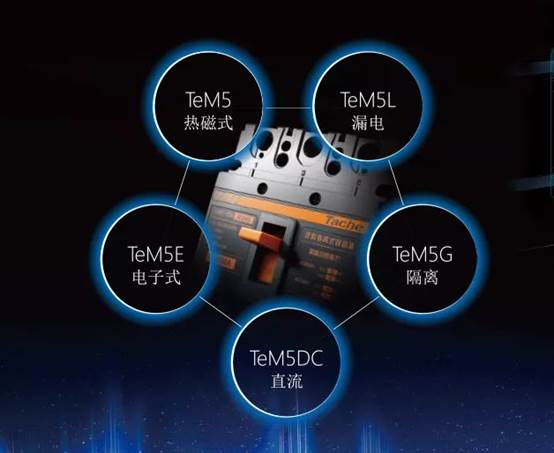 重磅發(fā)布的全新TeM5塑殼斷路器,擁有齊全的熱磁式,漏電,電子式,直流,隔離五大系列產(chǎn)品。此外,該系列還增加特殊功能用途產(chǎn)品:如過載報(bào)警不脫扣斷路器、A型漏電斷路器等。