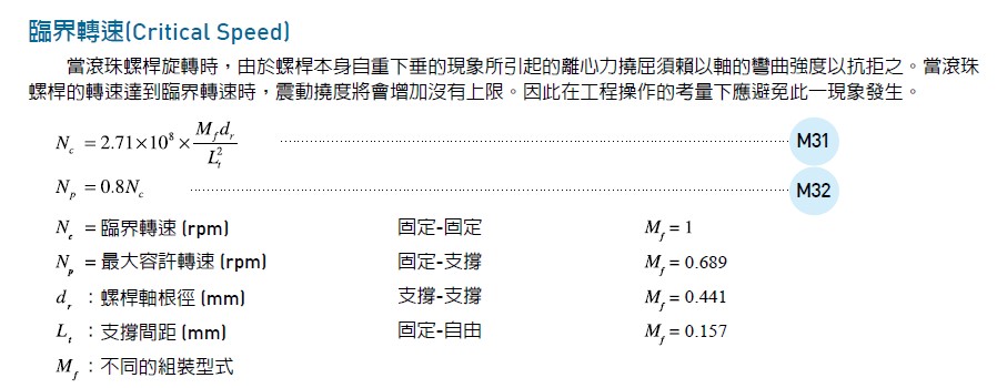 由于絲杠有兩個端頭,分別采用不同的安裝方式時,請對絲杠臨界轉(zhuǎn)速的影響系數(shù)不同,請參考上面的公式。