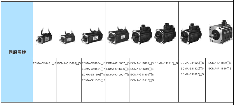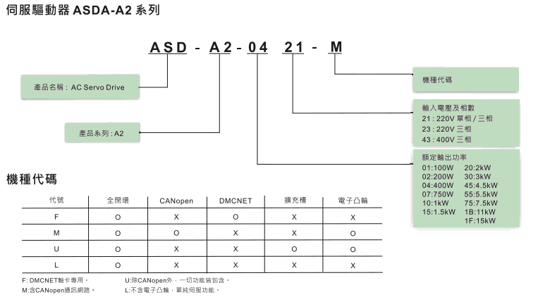 ?ASDA-A2系列共有四個(gè)機(jī)種:ASDA-A2-B, ASDA-A2-L, ASDA-A2-M, ASDA-A2-U
